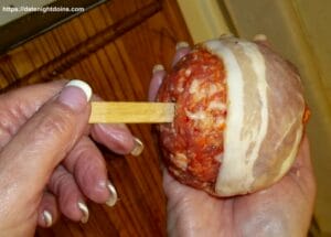 Wrap it with a strip of bacon. You don’t need anything to hold the bacon, it will stick by itself.